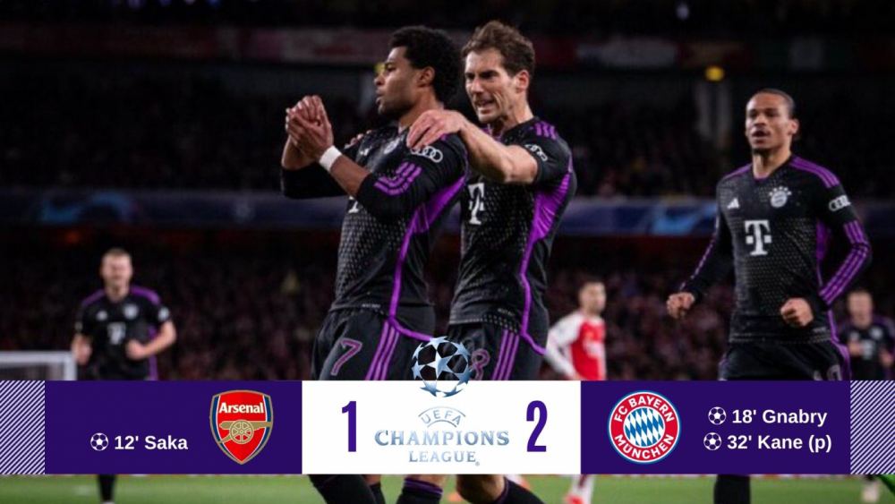 UEFA Şampiyonlar Ligi'nin çeyrek final aşamasındaki eşleşmede Arsena-Bayern Münih karşılaşmasının ilk yarısı, 2-1 Bayern Münih'in üstünlüğüyle kapandı.